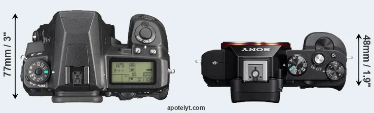 An illustration of the physical size and weight of the Pentax K-3 and the Sony A7R is provided in the side-by-side display below. The two cameras are presented according to their relative size. Three successive views from the front, the top, and the rear are shown. All width, height and depth dimensions are rounded to the nearest millimeter.