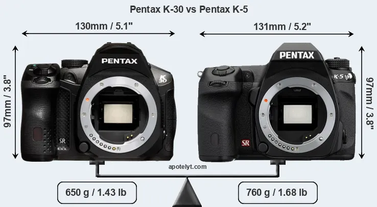 An illustration of the physical size and weight of the Pentax K-30 and the Pentax K-5 is provided in the side-by-side display below. The two cameras are presented according to their relative size. Three consecutive perspectives from the front, the top, and the back are available. All size dimensions are rounded to the nearest millimeter.