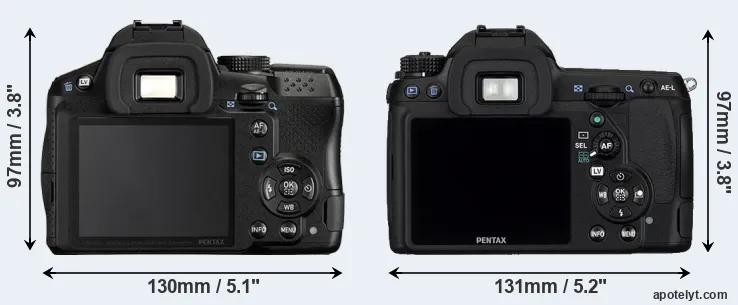 | 7. | Pentax K-500 | 130 mm | 97 mm | 71 mm | 646 g | 710 | n | Jun 2013 | US$ 549 | ebay.com | |