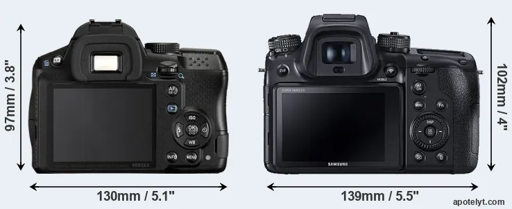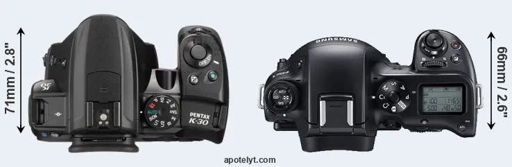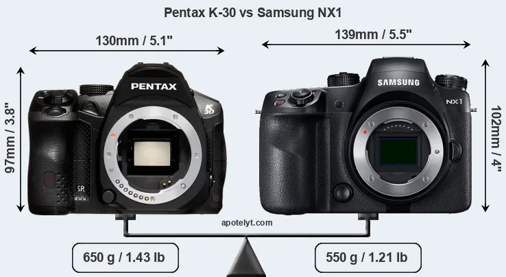 The physical size and weight of the Pentax K-30 and the Samsung NX1 are illustrated in the side-by-side display below. The two cameras are presented according to their relative size. Three consecutive perspectives from the front, the top, and the back are available. All width, height and depth dimensions are rounded to the nearest millimeter.