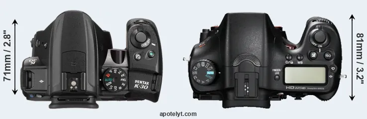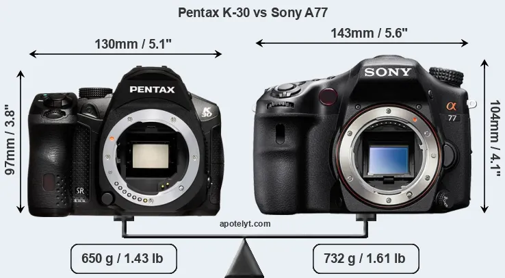 The physical size and weight of the Pentax K-30 and the Sony A77 are illustrated in the side-by-side display below. The two cameras are presented according to their relative size. Three consecutive views from the front, the top, and the rear side are shown. All width, height and depth dimensions are rounded to the nearest millimeter.
