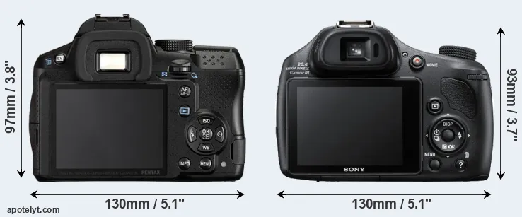 The side-by-side display below illustrates the physical size and weight of the Pentax K-30 and the Sony HX400V. The two cameras are presented according to their relative size. Three consecutive perspectives from the front, the top, and the back are available. All size dimensions are rounded to the nearest millimeter.