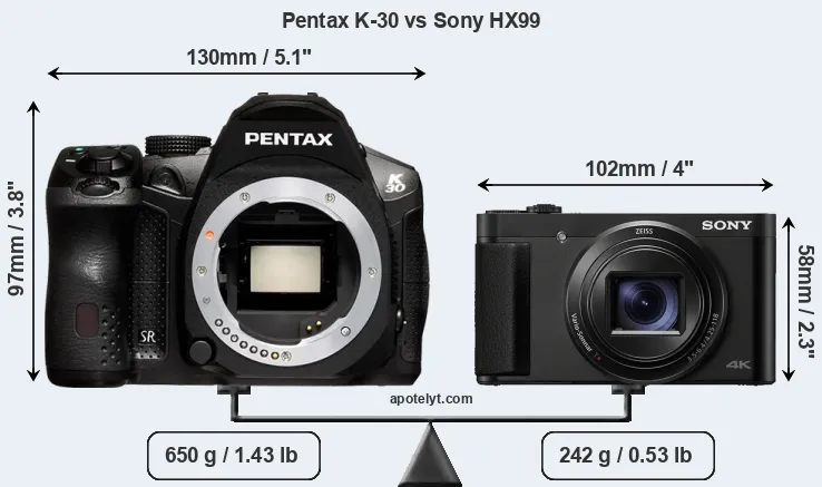 An illustration of the physical size and weight of the Pentax K-30 and the Sony HX99 is provided in the side-by-side display below. The two cameras are presented according to their relative size. Three successive views from the front, the top, and the rear are shown. All width, height and depth dimensions are rounded to the nearest millimeter.