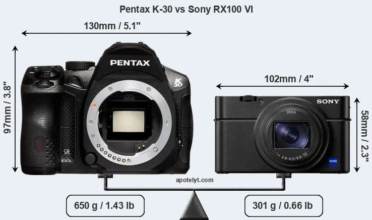 If the front view area (width x height) of the cameras is taken as an aggregate measure of their size, the Sony RX100 VI is considerably smaller (53 percent) than the Pentax K-30. It is worth mentioning in this context that the K-30 is splash and dust resistant, while the RX100 VI does not feature any corresponding weather-sealing.
