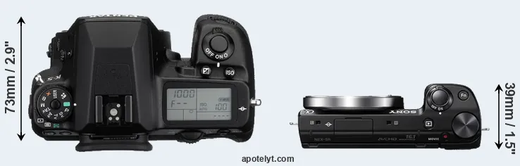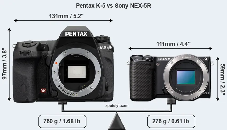An illustration of the physical size and weight of the Pentax K-5 and the Sony NEX-5R is provided in the side-by-side display below. The two cameras are presented according to their relative size. Three successive views from the front, the top, and the rear are shown. All width, height and depth dimensions are rounded to the nearest millimeter.