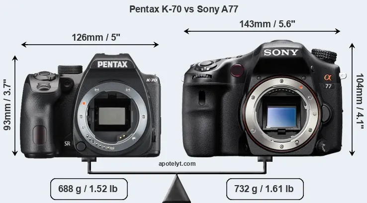An illustration of the physical size and weight of the Pentax K-70 and the Sony A77 is provided in the side-by-side display below. The two cameras are presented according to their relative size. Three successive views from the front, the top, and the rear are shown. All width, height and depth dimensions are rounded to the nearest millimeter.