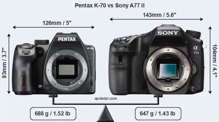 An illustration of the physical size and weight of the Pentax K-70 and the Sony A77 II is provided in the side-by-side display below. The two cameras are presented according to their relative size. Three successive views from the front, the top, and the rear are shown. All width, height and depth dimensions are rounded to the nearest millimeter.