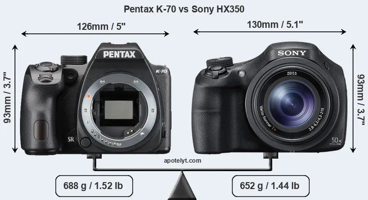 An illustration of the physical size and weight of the Pentax K-70 and the Sony HX350 is provided in the side-by-side display below. The two cameras are presented according to their relative size. Three consecutive views from the front, the top, and the rear side are shown. All size dimensions are rounded to the nearest millimeter.