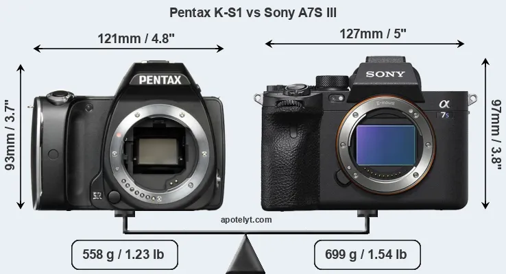 If the front view area (width x height) of the cameras is taken as an aggregate measure of their size, the Sony A7S III is notably larger (9 percent) than the Pentax K-S1. Moreover, the A7S III is markedly heavier (25 percent) than the K-S1. It is noteworthy in this context that the A7S III is splash and dust-proof, while the K-S1 does not feature any corresponding weather-sealing.