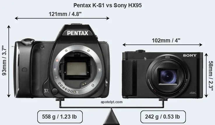 If the front view area (width x height) of the cameras is taken as an aggregate measure of their size, the Sony HX95 is considerably smaller (47 percent) than the Pentax K-S1. In this context, it is worth noting that neither the K-S1 nor the HX95 are weather-sealed.