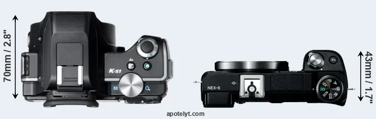 The side-by-side display below illustrates the physical size and weight of the Pentax K-S1 and the Sony NEX-6. The two cameras are presented according to their relative size. Three successive views from the front, the top, and the rear are shown. All width, height and depth measures are rounded to the nearest millimeter.