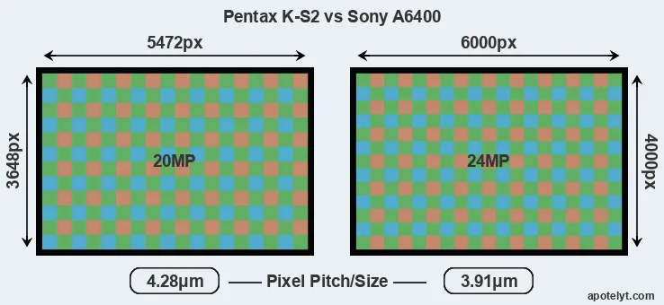 While the two cameras under review share the same sensor size, the A6400 offers a higher resolution of 24 megapixels, compared with 20 MP of the K-S2. This megapixels advantage translates into a 10 percent gain in linear resolution. On the other hand, these sensor specs imply that the A6400 has a higher pixel density and a smaller size of the individual pixel (with a pixel pitch of 3.91μm versus 4.28μm for the K-S2). However, it should be noted that the A6400 is much more recent (by 3 years and 11 months) than the K-S2, and its sensor will have benefitted from technological advances during this time that compensate for the smaller pixel size. Coming back to sensor resolution, it should be mentioned that the K-S2 has no anti-alias filter installed, so that it can capture all the detail its sensor resolves.