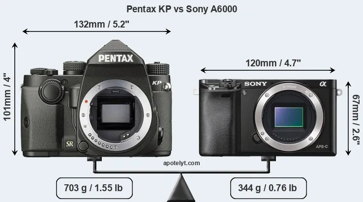 If the front view area (width x height) of the cameras is taken as an aggregate measure of their size, the Sony A6000 is considerably smaller (40 percent) than the Pentax KP. Moreover, the A6000 is substantially lighter (51 percent) than the KP. It is worth mentioning in this context that the KP is splash and dust resistant, while the A6000 does not feature any corresponding weather-sealing.