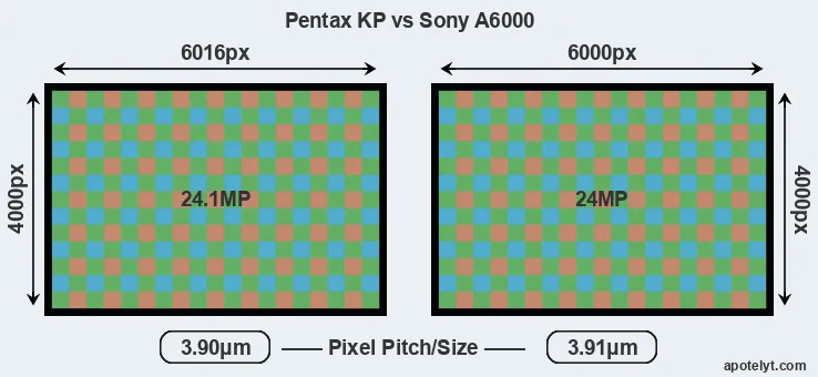 While the two cameras under review share the same sensor size, the KP offers a slightly higher resolution of 24.1 megapixels, compared with 24 MP of the A6000. This megapixels advantage translates into a 0.3 percent gain in linear resolution. On the other hand, these sensor specs imply that the KP has a higher pixel density and a smaller size of the individual pixel (with a pixel pitch of 3.90μm versus 3.91μm for the A6000). In this context, it should be noted, however, that the KP is much more recent (by 2 years and 11 months) than the A6000, and its sensor will have benefitted from technological advances during this time that compensate for the smaller pixel size. Coming back to sensor resolution, it should be mentioned that the KP has no anti-alias filter installed, so that it can capture all the detail its sensor resolves.