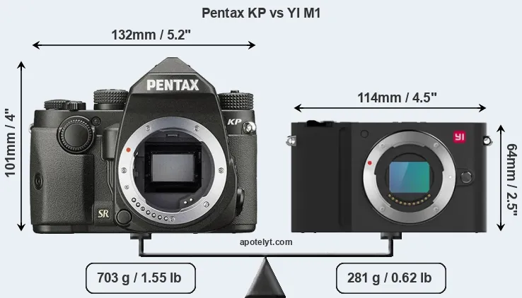 The physical size and weight of the Pentax KP and the YI M1 are illustrated in the side-by-side display below. The two cameras are presented according to their relative size. Three successive views from the front, the top, and the rear are shown. All width, height and depth dimensions are rounded to the nearest millimeter.