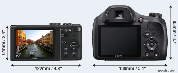 The side-by-side display below illustrates the physical size and weight of the Pentax MX-1 and the Sony H400. The two cameras are presented according to their relative size. Three consecutive perspectives from the front, the top, and the back are available. All width, height and depth measures are rounded to the nearest millimeter.