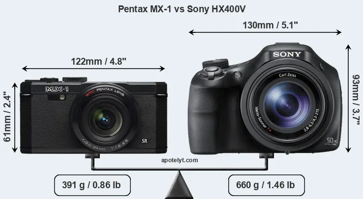 If the front view area (width x height) of the cameras is taken as an aggregate measure of their size, the Sony HX400V is considerably larger (62 percent) than the Pentax MX-1. Moreover, the HX400V is substantially heavier (69 percent) than the MX-1. In this context, it is worth noting that neither the MX-1 nor the HX400V are weather-sealed.