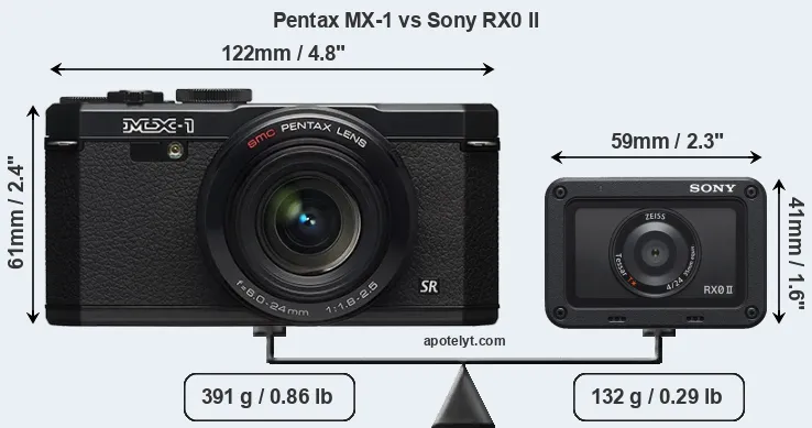 If the front view area (width x height) of the cameras is taken as an aggregate measure of their size, the Sony RX0 II is considerably smaller (67 percent) than the Pentax MX-1. Moreover, the RX0 II is substantially lighter (66 percent) than the MX-1. It is noteworthy in this context that the RX0 II is splash and dust-proof, while the MX-1 does not feature any corresponding weather-sealing. More than that, the RX0 II is water-proof up to 10m and can, thus, be used for underwater photography.