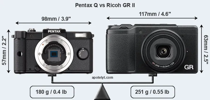 The above size and weight comparisons are to some extent incomplete and possibly misleading, as the GR II has a lens built in, whereas the Pentax Q is an interchangeable lens camera that requires a separate lens. Attaching the latter will add extra weight and bulk to the setup.