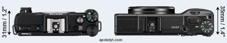 The side-by-side display below illustrates the physical size and weight of the Pentax Q and the Ricoh GR II. The two cameras are presented according to their relative size. Three consecutive views from the front, the top, and the rear side are shown. All width, height and depth dimensions are rounded to the nearest millimeter.