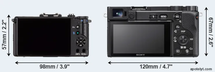The physical size and weight of the Pentax Q and the Sony A6100 are illustrated in the side-by-side display below. The two cameras are presented according to their relative size. Three successive views from the front, the top, and the rear are shown. All width, height and depth measures are rounded to the nearest millimeter.