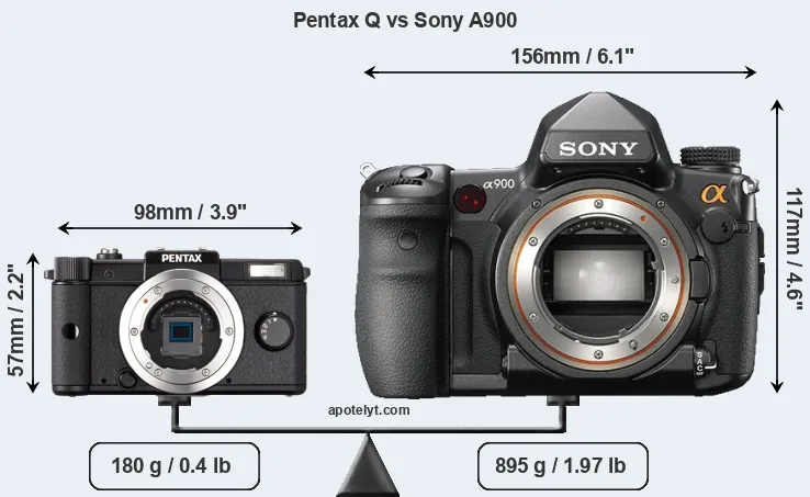 If the front view area (width x height) of the cameras is taken as an aggregate measure of their size, the Sony A900 is considerably larger (227 percent) than the Pentax Q. Moreover, the A900 is substantially heavier (397 percent) than the Pentax Q. It is noteworthy in this context that the A900 is splash and dust-proof, while the Pentax Q does not feature any corresponding weather-sealing.