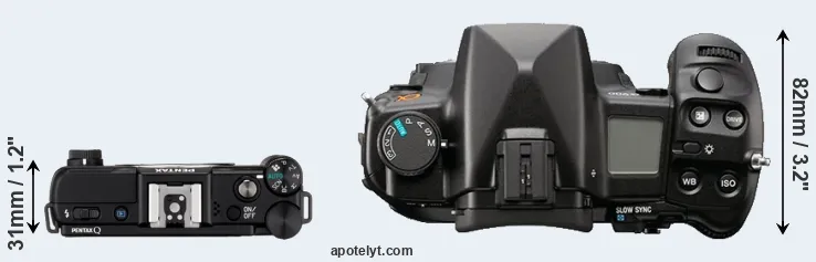 An illustration of the physical size and weight of the Pentax Q and the Sony A900 is provided in the side-by-side display below. The two cameras are presented according to their relative size. Three consecutive views from the front, the top, and the rear side are shown. All width, height and depth dimensions are rounded to the nearest millimeter.