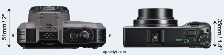The side-by-side display below illustrates the physical size and weight of the Pentax WG-1000 and the Ricoh GR IIIx. The two cameras are presented according to their relative size. Three successive views from the front, the top, and the rear are shown. All width, height and depth dimensions are rounded to the nearest millimeter.