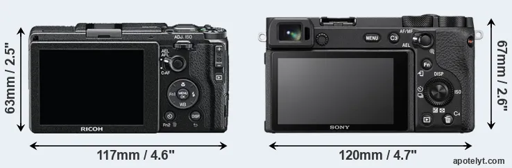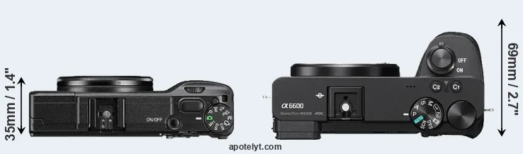 The physical size and weight of the Ricoh GR II and the Sony A6600 are illustrated in the side-by-side display below. The two cameras are presented according to their relative size. Three successive views from the front, the top, and the rear are shown. All width, height and depth dimensions are rounded to the nearest millimeter.