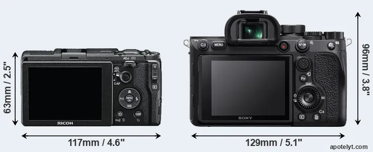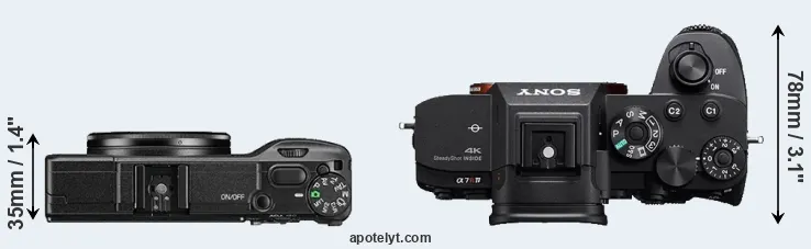 The above size and weight comparisons are to some extent incomplete and possibly misleading, as the GR II has a lens built in, whereas the A7R IV is an interchangeable lens camera that requires a separate lens. Attaching the latter will add extra weight and bulk to the setup. You can compare the optics available for the A7R IV and their specifications in the Sony FE Lens Catalog.
