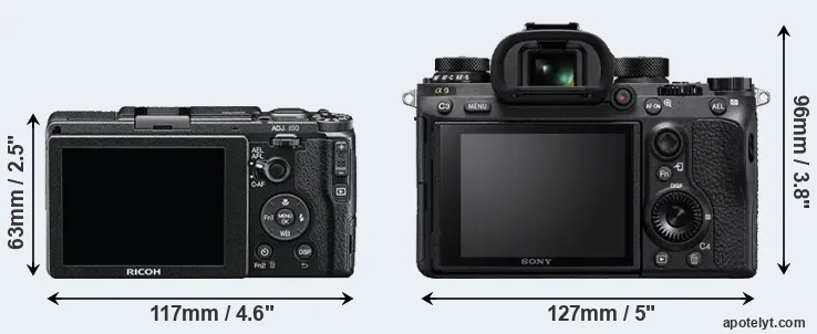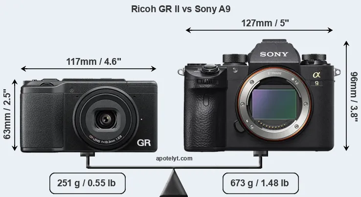 If the front view area (width x height) of the cameras is taken as an aggregate measure of their size, the Sony A9 is considerably larger (65 percent) than the Ricoh GR II. It is noteworthy in this context that the A9 is splash and dust-proof, while the GR II does not feature any corresponding weather-sealing.