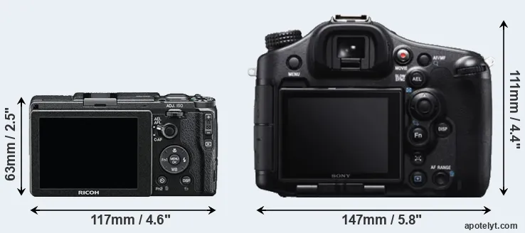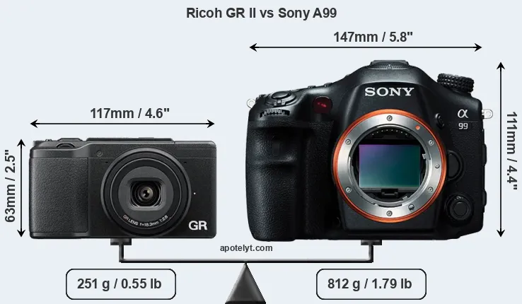 The physical size and weight of the Ricoh GR II and the Sony A99 are illustrated in the side-by-side display below. The two cameras are presented according to their relative size. Three successive views from the front, the top, and the rear are shown. All width, height and depth measures are rounded to the nearest millimeter.