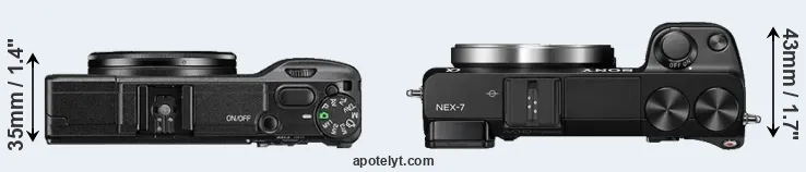 The physical size and weight of the Ricoh GR II and the Sony NEX-7 are illustrated in the side-by-side display below. The two cameras are presented according to their relative size. Three successive views from the front, the top, and the rear are shown. All width, height and depth dimensions are rounded to the nearest millimeter.