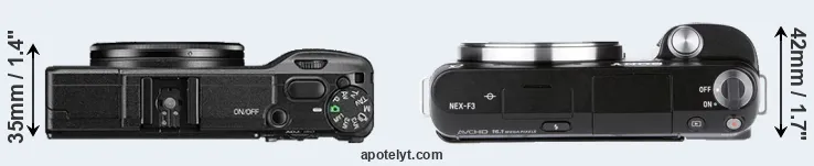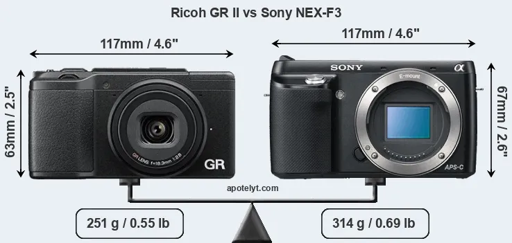 The side-by-side display below illustrates the physical size and weight of the Ricoh GR II and the Sony NEX-F3. The two cameras are presented according to their relative size. Three consecutive perspectives from the front, the top, and the back are available. All size dimensions are rounded to the nearest millimeter.