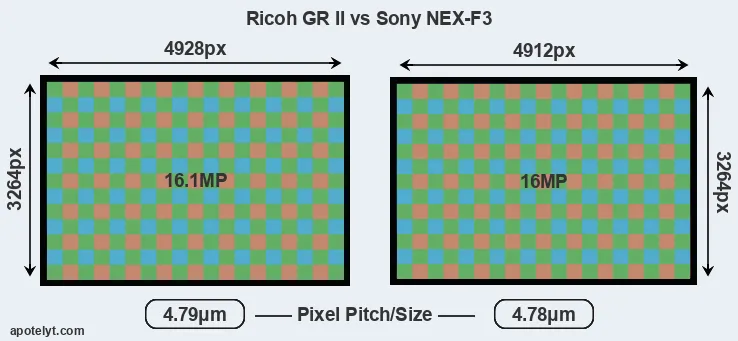 | Sensor Specs | Ricoh GR II | Sony NEX-F3 |