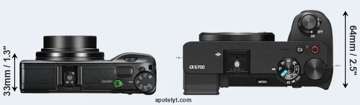 The physical size and weight of the Ricoh GR III and the Sony A6700 are illustrated in the side-by-side display below. The two cameras are presented according to their relative size. Three consecutive perspectives from the front, the top, and the back are available. All width, height and depth measures are rounded to the nearest millimeter.