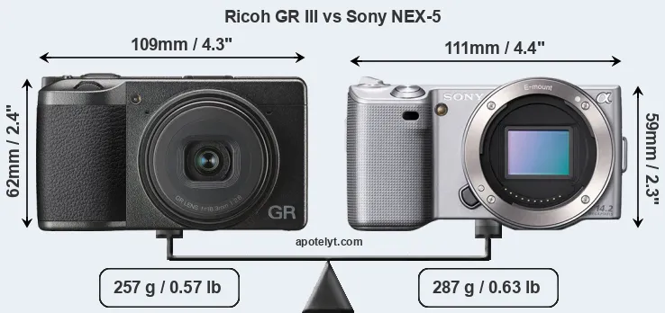 An illustration of the physical size and weight of the Ricoh GR III and the Sony NEX-5 is provided in the side-by-side display below. The two cameras are presented according to their relative size. Three consecutive perspectives from the front, the top, and the back are available. All width, height and depth measures are rounded to the nearest millimeter.