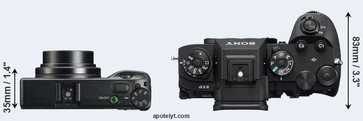 The side-by-side display below illustrates the physical size and weight of the Ricoh GR IIIx and the Sony A9 III. The two cameras are presented according to their relative size. Three consecutive perspectives from the front, the top, and the back are available. All width, height and depth measures are rounded to the nearest millimeter.