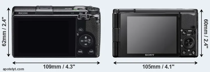 An illustration of the physical size and weight of the Ricoh GR IIIx and the Sony ZV-1 is provided in the side-by-side display below. The two cameras are presented according to their relative size. Three consecutive views from the front, the top, and the rear side are shown. All width, height and depth measures are rounded to the nearest millimeter.