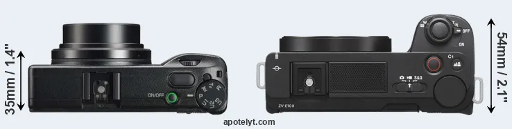 The above size and weight comparisons are to some extent incomplete and possibly misleading, as the GR IIIx has a lens built in, whereas the ZV-E10 II is an interchangeable lens camera that requires a separate lens. Attaching the latter will add extra weight and bulk to the setup. You can compare the optics available for the ZV-E10 II and their specifications in the Sony E-Mount Lens Catalog.