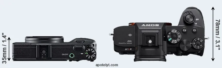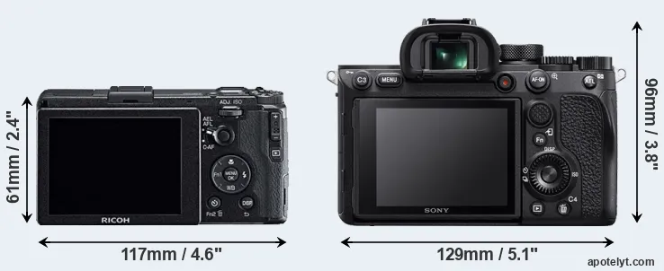 The above size and weight comparisons are to some extent incomplete and possibly misleading, as the GR has a lens built in, whereas the A7R IV is an interchangeable lens camera that requires a separate lens. Attaching the latter will add extra weight and bulk to the setup. You can compare the optics available for the A7R IV and their specifications in the Sony FE Lens Catalog.