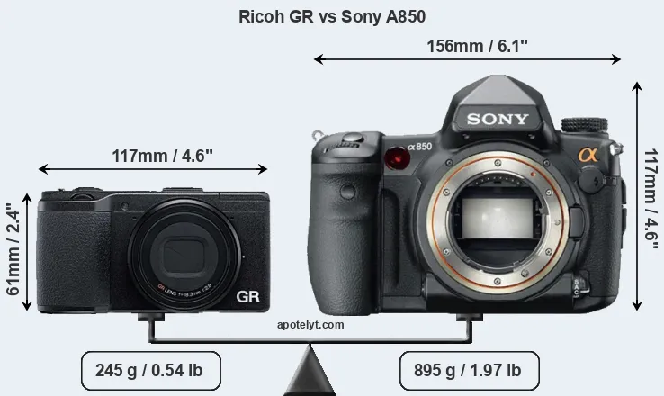 If the front view area (width x height) of the cameras is taken as an aggregate measure of their size, the Sony A850 is considerably larger (156 percent) than the Ricoh GR. It is noteworthy in this context that the A850 is splash and dust-proof, while the GR does not feature any corresponding weather-sealing.