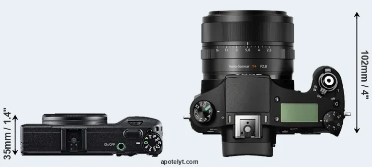 An illustration of the physical size and weight of the Ricoh GR and the Sony RX10 is provided in the side-by-side display below. The two cameras are presented according to their relative size. Three successive views from the front, the top, and the rear are shown. All width, height and depth dimensions are rounded to the nearest millimeter.