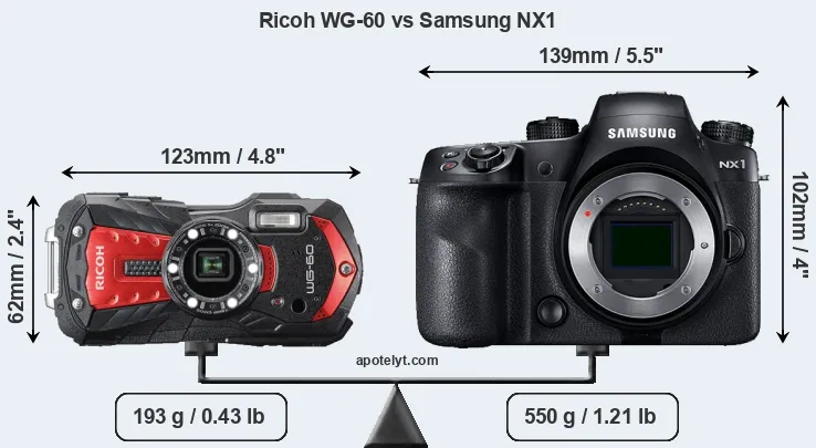 An illustration of the physical size and weight of the Ricoh WG-60 and the Samsung NX1 is provided in the side-by-side display below. The two cameras are presented according to their relative size. Three successive views from the front, the top, and the rear are shown. All width, height and depth dimensions are rounded to the nearest millimeter.