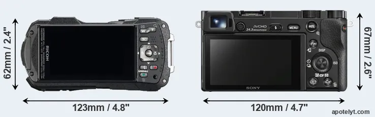 The physical size and weight of the Ricoh WG-60 and the Sony A6000 are illustrated in the side-by-side display below. The two cameras are presented according to their relative size. Three successive views from the front, the top, and the rear are shown. All width, height and depth dimensions are rounded to the nearest millimeter.