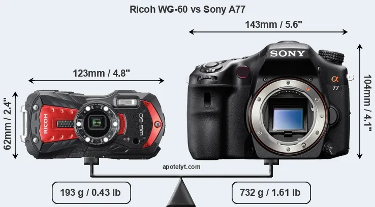 The physical size and weight of the Ricoh WG-60 and the Sony A77 are illustrated in the side-by-side display below. The two cameras are presented according to their relative size. Three consecutive perspectives from the front, the top, and the back are available. All width, height and depth dimensions are rounded to the nearest millimeter.