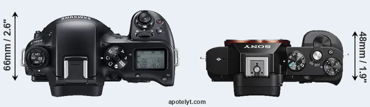 An illustration of the physical size and weight of the Samsung NX1 and the Sony A7S is provided in the side-by-side display below. The two cameras are presented according to their relative size. Three consecutive views from the front, the top, and the rear side are shown. All width, height and depth measures are rounded to the nearest millimeter.