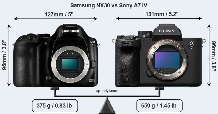 If the front view area (width x height) of the cameras is taken as an aggregate measure of their size, the Sony A7 IV is somewhat larger (3 percent) than the Samsung NX30. Moreover, the A7 IV is substantially heavier (76 percent) than the NX30. It is noteworthy in this context that the A7 IV is splash and dust-proof, while the NX30 does not feature any corresponding weather-sealing.