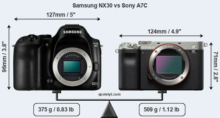If the front view area (width x height) of the cameras is taken as an aggregate measure of their size, the Sony A7C is notably smaller (28 percent) than the Samsung NX30. However, the A7C is substantially heavier (36 percent) than the NX30. It is noteworthy in this context that the A7C is splash and dust-proof, while the NX30 does not feature any corresponding weather-sealing.