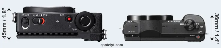 The side-by-side display below illustrates the physical size and weight of the Sigma fp L and the Sony A5100. The two cameras are presented according to their relative size. Three consecutive views from the front, the top, and the rear side are shown. All width, height and depth dimensions are rounded to the nearest millimeter.